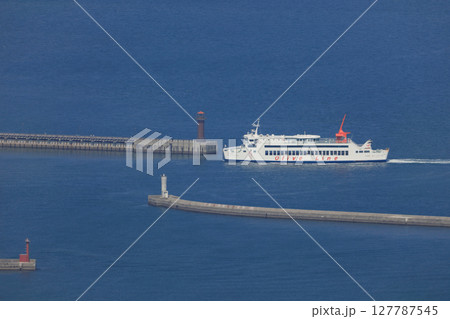高松港の玉藻防波堤と赤灯台(せとしるべ)脇を通過して入港するフェリー(しょうどしま丸)