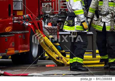 ホースをつなぎ消火活動中のポンプ車と消防士