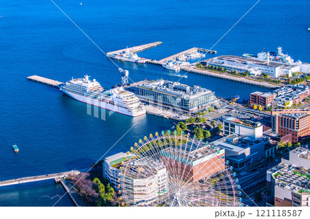 日本の横浜都市景観 横浜ハンマーヘッドや新港ふ頭客船ターミナルなどを望む。左はシエルブルー=23日