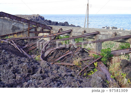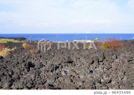 海沿いの溶岩流と旧阿古小学校校舎(東京都三宅島)