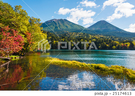 北海道 紅葉の雄阿寒岳と阿寒湖