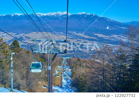 冬の長野県富士見町の富士見パノラマリゾートのゴンドラから八ヶ岳連峰、富士見町などを見る