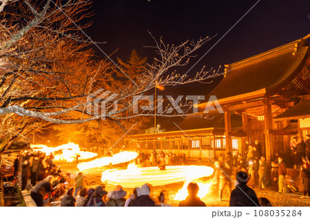 氏子が茅で作った松明に火をつけて振り回して祝う火振り神事風景(国指定の農耕神事)(阿蘇神社)阿蘇市