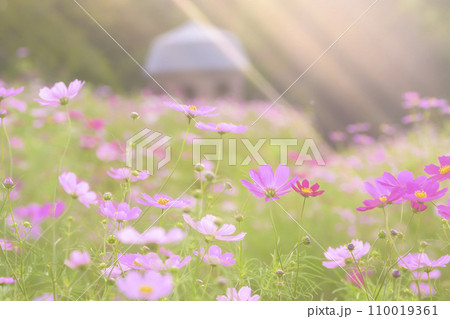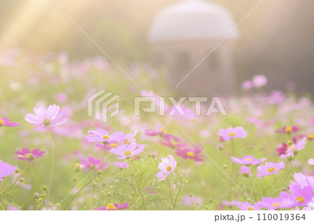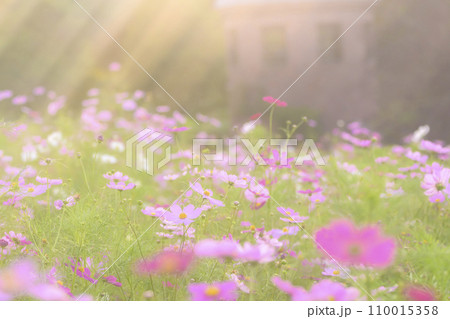 光が降りそそぐ夕景のコスモス(特殊撮影による柔らかいトーン)