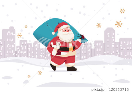 Santa Claus carrying gifts in snowy cityscape festive winter scene with dog snowflakes and buildings holiday celebration concept