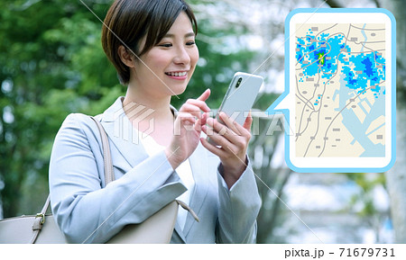 スマホで雨雲レーダーをチェックする女性会社員のイメージ