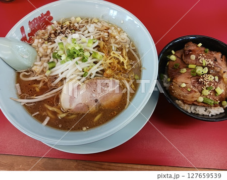 ラーメン山岡家の焦がし醤油ラーメン(期間限定)とチャーシュー丼