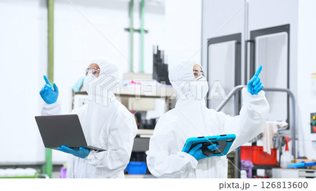 防護服・無塵服を着た作業員 (ガッツポーズ 研究職 食品加工 医療 作業着 クリーンルーム)