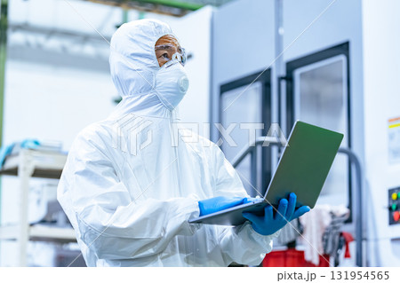 ノートパソコンを持って工場で作業する防護服を着た男性作業員