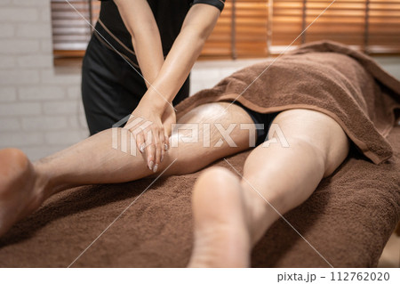 メンズエステ・脱毛サロンで足をマッサージするエステティシャンと男性