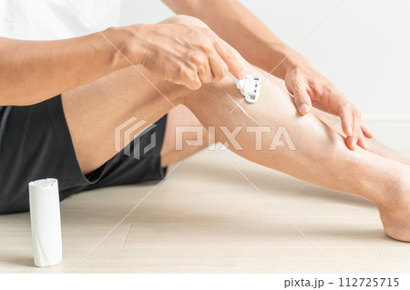 脚のスキンケアをする男性(シェービングクリーム・ムダ毛処理・除毛・剃毛・自己処理)