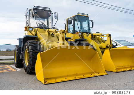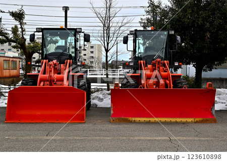 駐車場で除雪作業に向け待機する除雪車|重機イメージ|除雪イメージ|ホイールローダーイメージ