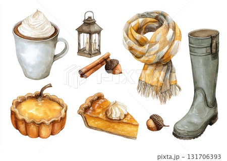Watercolor illustration of autumn-themed cozy items including pie, scarf, and boots for seasonal decor