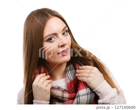 Stack of folded blankets and cozy socks isolated on white background. Pile of autumn domestic elements. Soft textile apparel. Vector flat illustration
