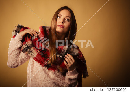 Young woman with curly hair wears oversized sweater and knit hat while holding smartphone and tablet