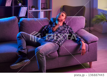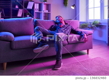 Exhausted man on couch under neon lights, evoking drugs, euphoria, and depression