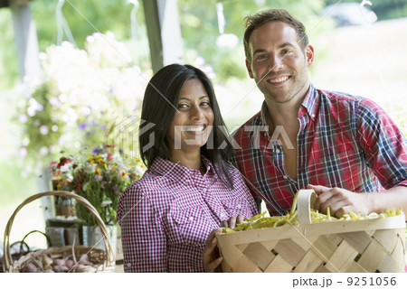 A farm stand with fresh organic vegetables and fruit. A man and woman with baskets of beans.