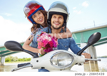 Cheerful couple riding vintage scooter