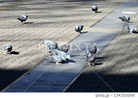 日本の横浜都市景観 師走。低く横切る太陽…ビル陰…新横浜駅前の陽だまりに集まりエサをさがすハトたち