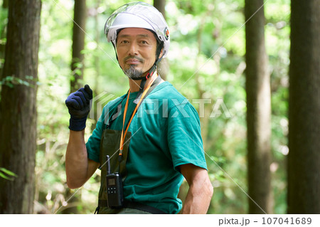 森にてガッツポーズをしながら視線を向ける男性 森林官 自然保護官 イメージ