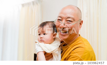 0歳の孫の赤ちゃんを抱っこする笑顔でカメラ目線のおじいちゃん