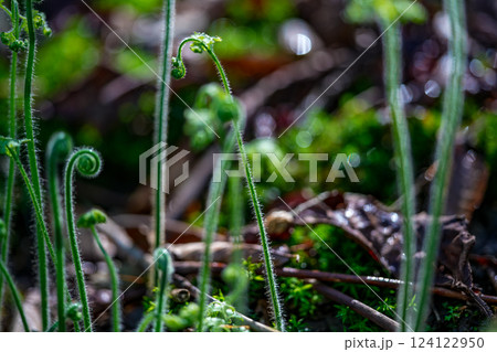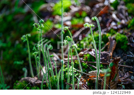 初夏の高清水トレイルの植物 朝日に照らされたシダ植物の新芽1 岡山県苫田郡鏡野町