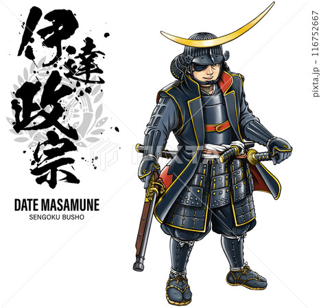 黒漆五枚胴具足を着た戦国武将の伊達政宗 筆文字 家紋