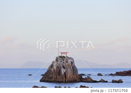 牛之浜景勝地 朝日を浴びる雀瀬の鳥居