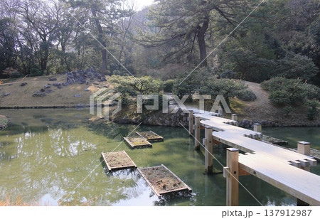 栗林公園の南庭、公園発祥の地とされる「小普陀」と睡竜潭にかかる雁行形の八つ橋「津筏梁」