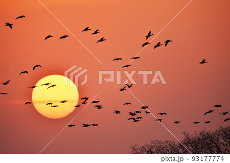 夕暮れにねぐらに戻るマガンと太陽(北海道・宮島沼)