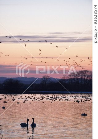 夕焼けに染まる宮島沼に着水するマガンとオハクチョウ(北海道)