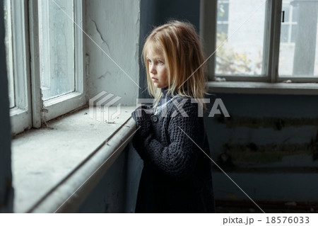 Depressed poot girl standing near window