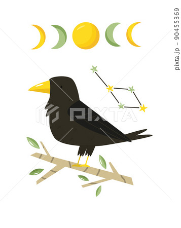 Vector illustration of a raven, constellation and moon phases