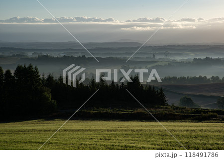 北海道 夏の青空と新緑の高原風景