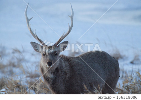 着雪した樹木とオスのエゾシカ(北海道)