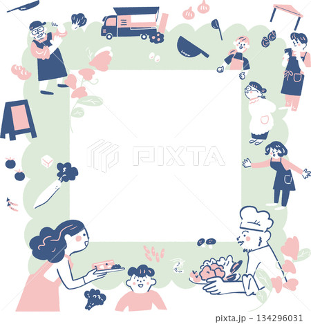活気あるマルシェと食のイベントのフレーム素材 人々が笑顔で集う温かい手書きイラスト