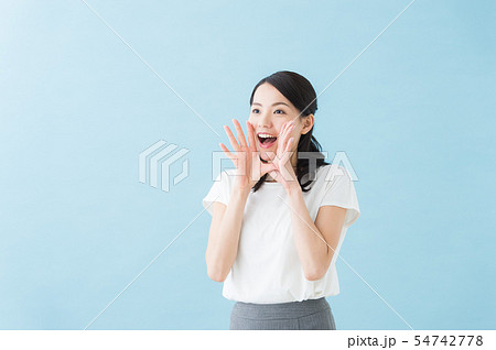 呼びかけをする若い女性 上半身 背景なし