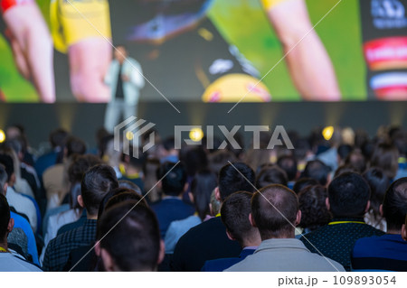 Back view of businesspeople listening to male speaker on stage during global presentation at conference hall