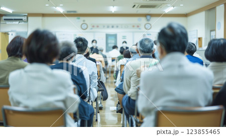 椅子で順番を待つ高齢女性 ワクチン接種 集団検診 イメージ
