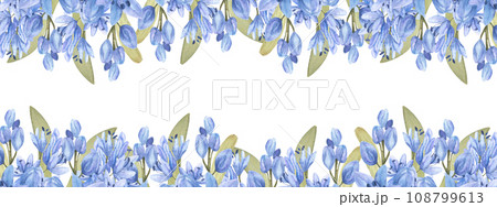 Watercolor blue flowers seamless banner, Hand drawn lilac flowers with green leaves in border for invitation, greeting card, label, packing decoration. Isolated on white background