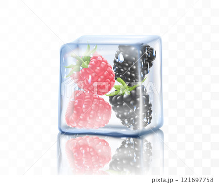 Fresh ripe raspberries and blackberries in big ice cube isolated on transparent background. Frozen berries, realistic 3d vector illustration