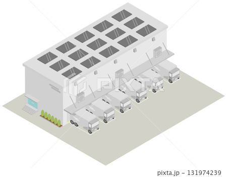 (アイソメトリック)中規模 物流倉庫の建物イラスト、大型トラックドックと太陽光パネル