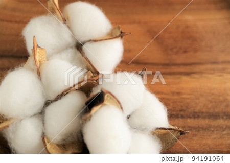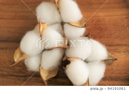 木製のテーブルに置いたコットンフラワー