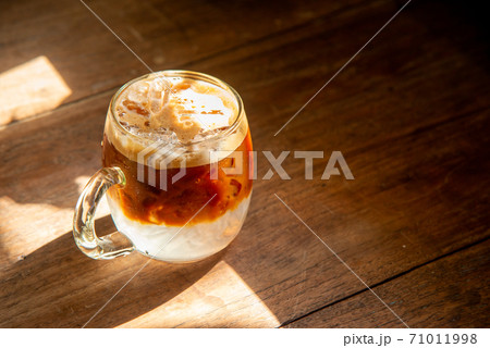 espresso shot mixed with soda on bottom in transperant glasses mug with coffee bubble on wooden table in morning light refreshment stock photo