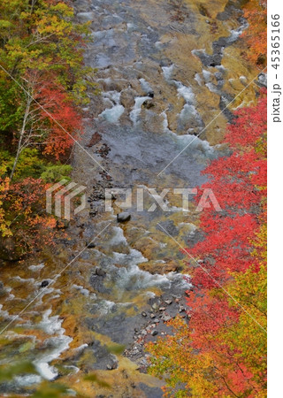 長野県奥志賀・雑魚川渓谷 渓谷の岸辺で紅葉した木