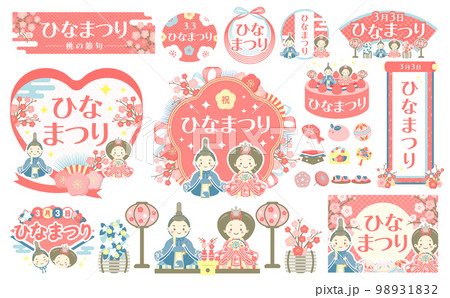 ポップで可愛いひなまつりのデザインフレームとイラストのセット_ベクター素材_赤_日本の伝統文化