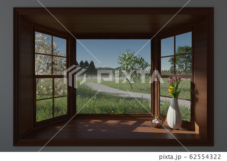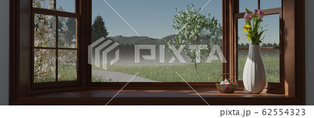 出窓の上に配置されたイースターエッグと花。春の野原の背景。