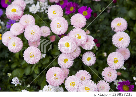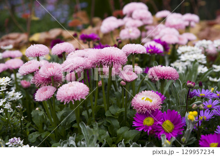 ピンク色のデイジー(ヒナギク)の花が咲いています。学名はBellis perennisです。