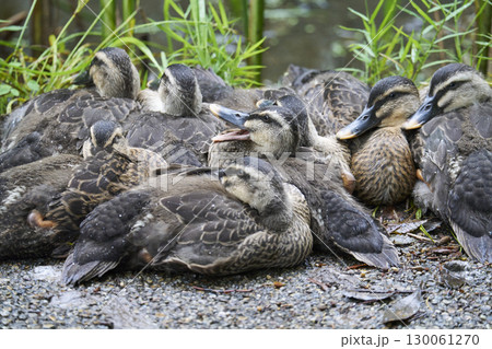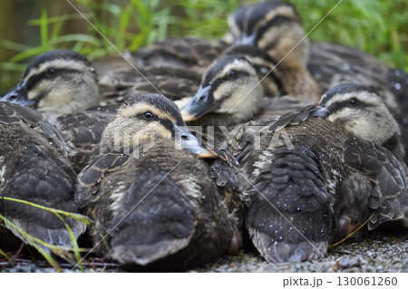 体を寄せ合うカルガモのヒナたち