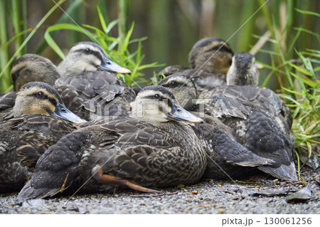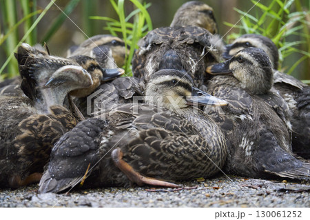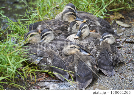 カルガモの親子 子ガモ達昼寝中